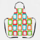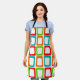 This apron has a mid-century modern design of repeating skewed rectangles in red, orange, green, and turquoise.