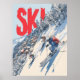 An exhilarating winter scene captures skiers carving down a steep, snow-covered mountainside above a colourful alpine village. Crisp white snow contrasts with deep blue shadows and towering frosted trees, while bold red lettering adds dynamic energy to the composition. The dramatic angle and sense of motion evoke speed, freedom, and the thrill of downhill skiing in a breathtaking mountain setting.