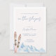 The ALBA ski bachelorette weekend invitation design features chic snow capped mountains and a pair of pink skis, with a pairing of a modern sans serif and script font. This bachelorette invite has a modern yet feminine design that works with a winter bachelorette party theme where you'll hit the slopes with your pals, and includes an itinerary template on the back side—along with a watercolor gondola.