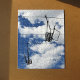 Two empty ski lift chairs hang from their lift cables in this striking photograph. With no riders, the ski lift looks like a black linear diagram in front of an expansive view of blue sky and white puffy clouds. The upper right chair heads uphill and the lower left chair returns downhill.