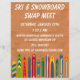 Promote your ski themed business or community event with a custom flyer. This eye-catching flyer features my illustrations of colorful vintage skis making it perfect for skiing themed events. The illustrations are set against a light brown background that has a horizontal stripe pattern mimicking the look of a ski lodge's wood siding. All of your event details are in bold white lettering.