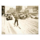 A fun photo print of a skier on K Street between 10th and 11th streets during the snowstorm of 1942 in Sacramento.