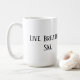 This mug features artwork of a skier jumping on one side, and the slogan 'Live. Breathe. Ski.' on the other side.