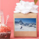Rectangular photo sticker with a female skier skiing on the slopes of Matterhorn mountain through fresh snow on a beautiful day with a clear blue sky in ski resort Zermatt, canton Valais in Switzerland.