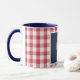 Farmhouse decor red & white gingham check pattern with modern white skinny font name on dark blue denim print. Easily change name, add text to make it yours using the Template provided. This 11oz classic combo mug has dark blue inside and handle. Choose from 9 other colours. Large capacity for hot or cold beverages. Also available in 15oz with 5 colour choices. Other mug styles and sizes are available. See "About This Product" at side for more information.
