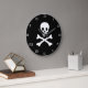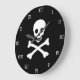 A traditional Skull and Crossbones from a pirate flag aka jolly roger, on a wall clock with hour markers of Roman numerals aka numbers , made of bones