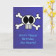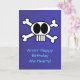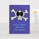 A pirate themed birthday card. Cool, cute and funny graphic illustration of skull and crossbones. A white skull with big black eyes and long white teeth. Purple background. Customise the message or leave as is.