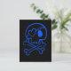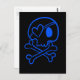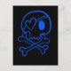 A neon blue skull and crossbone illustration with a heart shaped eyepatch. Black background.