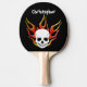 This skull design ping pong bat, or table tennis racket, can be customised with any text. The paddle is laminated wooden with a choice of a EVA on one side for graphic printing and a 2 ply "pips in" rubber face on the other or EVA on both sides for graphic images. Players select bats based on their playing style, considering the blade's materials for speed and power, the sponge's thickness for control, and the rubber's tackiness for spin. Should you require any help with customising then contact us through the message link on this page. Skull design table tennis bat.