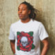 This design is a skull lying on a vibrant red rose. The skull is detailed with its eye sockets and teeth showing. This red rose is in a full bloom with lush green leaves on the side. This design is a contrast between life and death.