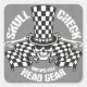 Logo for the fictional, "Skull Check Motorcycle Head Gear," features a skull and crossbones with a chequered top hat and chequered flags.