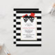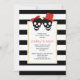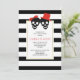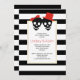 The elements of this contemporary red Halloween wedding couple's shower invitation are a fun black skull couple with a red bow and hat paired with an elegant black and white pattern border. Your text is in a white frame with gold outline.