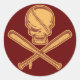 A baseball-head skull, with the stitches running down across one eye, and crossed bats. Red and orange graphic, on t-shirts, jerseys, cards & swag.