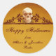 A scary sticker for the spookiest of holidays! A Victorian-style border topped by a skull highlights your Halloween message. It sits against a moody orange background. Set the mood for fright and hold onto someone tight! Great as envelope or package seals or closing trick or treat favour bags. Available in alternate background colours with matching postage and invitations.