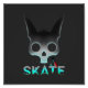 Skull Graffiti Skater Cat, The mischievous urban super hero, Ska Punk cool cat Ferzio, atop a neon glowing Skate billboard sign spray painting some graffiti of a cat skull.