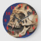 A shot of a Skull closeup that's bright and colorful. With Teeth, Bullet Hole and one Eye. That's on a Large wall Clock.