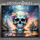 This tissue paper design features a striking skull adorned with vibrant, colourful flowers, creating a beautiful contrast with its skeletal form. The backdrop is a delicate, pastel landscape with soft rolling hills and majestic castles perched in the distance. The combination of the skull's bold floral decorations and the dreamy, serene scenery evokes a sense of harmony between life and death, strength and fragility. Perfect for decoupage projects, this design brings an elegant, whimsical, and mystical touch to any artistic creation.