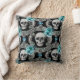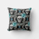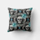 Grey skulls and teal blue flowers are the feature on this unique and attractive pillow. The pattern is placed on a dramatic black background. Both sides of the pillow have the same image.