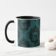 Introducing our hauntingly stylish Halloween mug, where eerie meets elegance in a mesmerising display of artistry. This mug features a striking black and green pattern adorned with skulls, all intricately framed within an elaborate scroll frame. The design is set upon a background of alternating light and dark green stripes, adding depth and intrigue to the overall aesthetic.