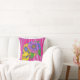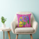 Pink and purple skull print throw pillow features an abstract line art style skull with a flower head piece, in shades of yellow, green , pink , purple, and blue, against a pink and purple abstract striped background. Original ink and pencil artwork and digital artwork by The Gifted Grackle.
