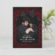 Let your future wedding guests know that you're getting married and that you want them to save the date for your upcoming goth wedding. Personalise the save the date card with a romantic photo of the happy couple inside a tombstone-shape adorned with a black bow against a damask pattern of black skull against a deep red background. Your names and wedding date are written in a gothic font that perfectly fits the dark romance theme for your gothic wedding!