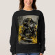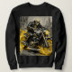 Biker skeleton charging through a fiery ride; bold yellow flames, black leather, and a gritty city backdrop convey rebellious, nocturnal energy.