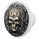 This Gothic drawer or door knob has a design on it resembling a shield with a skull in the center.