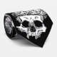 Vintage black and white gothic drawing of a skull wearing a crown on patterned black dress tie.