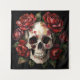Tapestry features goth watercolor artwork of a human skull surrounded by red roses against a black background.