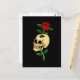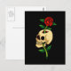 A classic vintage tattoo art image of a skull with the stem of a red rose growing through it.