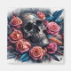 Intricate artwork featuring a beautifully detailed skull adorned with roses, feathers, and a vibrant bluebird, symbolising the contrast between life, death, beauty, and transformation in an elegant artistic arrangement.