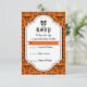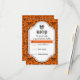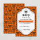 Skulls damask orange, black pattern & banner Halloween wedding RSVP reply/response card. This elegant design features a damask floral and skull pattern, a frame in the centre, a black skull and an orange banner. A contemporary yet classy design with two fonts: a vintage and a cool one. Elegantly spooky design, perfect for Gothic or Halloween fall/autumn weddings. It is a fully customisable template and is part of a wedding set.