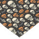 Orange and ivory skulls, interspersed with jack o'lanterns, bats, and stars combine to make a cute and fun tablecloth for Halloween.