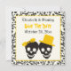 Elegant skulls Halloween black yellow wedding Save the Date announcement displaying a fun black skull couple bride and groom on ivory background along with a skull pattern border. The groom wears a yellow hat and the bride a yellow bow.