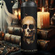 Three human skulls against backdrop of black, A little critter peeking over the middle skull