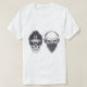 Two skulls on a white base shirt, one is wearing a beanie with the number 13 on it and a pair of sunglasses, the other is wearing a bandanna over its mouth and a pair of headphones.