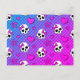 This playful and edgy design features a vibrant blend of pastel purple, pink, and blue hues in a gradient checkerboard background. Scattered across the pattern are cartoon-style skulls adorned with pink bows, giving them a cute yet punk-inspired twist. Accompanying the skulls are bold pink hearts and outlined purple stars, adding a fun, whimsical feel. The overall aesthetic combines elements of kawaii and emo-pop culture.