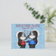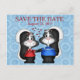 Mr. and Mrs Skunk hugging with hearts over their head. Fun save the date postcard to send to wedding guests.