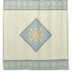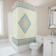 This intricate Shower curtain has lacey cream medallions. Cream medallions on a sky-blue background festoon the upper and lower border. The Medallions images come from an actual handmade tile by Oregon tile maker Fay Jones Day.