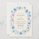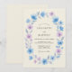 Delicate watercolor blossoms in sky blue and lavender adorn this elegant design, creating a romantic floral wreath. The soft colour palette evokes a serene and charming atmosphere, perfect for a whimsical celebration. This artful arrangement brings a touch of springtime freshness to your special day.