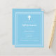 A sky blue background, decorated with a white frame, and a white cross Personalise and add the name and details. White text.