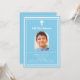 A sky blue background, decorated with a white frame, and a white cross Personalise and add a photo name and details. White text. Arch shaped photo frame.