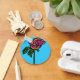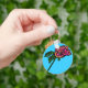 This pretty keychain features a colourful rose on a sky blue background