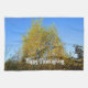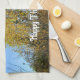 A Thanksgiving tea towel featuring a vibrant autumn scene of sunlit trees adorned with yellow and green leaves, set against a flawless blue sky. You can personalize it with a greeting, expression, or name.
