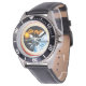 My husband loves the watch, he likes the dial, the graphics, the band, and it keeps perfect time.