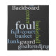 The artwork features a word cloud design prominently displayed against a solid black background. Various words and phrases associated with basketball are arranged in a dynamic and visually engaging manner. Terms like "backboard," "basket," "dunk," "foul," "full-court," "goaltending," "guard," "centre," "goal," "line," "field," "press," and "basketball" are presented in different sizes, weights, and orientations (horizontal and vertical). The colour palette includes shades of white, light blue, and lime green, providing contrast and highlighting different aspects of the basketball lexicon. The overall effect is a bold and impactful representation of the language of the game.