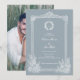 This dusty blue vintage ornate frame wedding photo invitation design sets a refined and romantic tone for your special day, perfectly embodying timeless classic elegance with a touch of French country charm. Featuring a soft dusty blue background adorned with delicate white line-art botanical borders, an intricate vintage ornate frame, and a custom monogram at the center—paired with a dedicated photo slot on the reverse to showcase your favorite couple portrait—this design blends elegant script calligraphy with understated serif fonts for a polished, sophisticated feel.