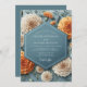 Evoke an air of sophisticated autumn elegance with this stunning botanical design. Lush marigolds in warm orange tones and creamy white chrysanthemums pop against a cool, dusty slate blue backdrop. Delicate, muted foliage is artfully woven throughout, creating a rich tapestry perfect for a chic fall union.