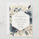 This elegant design features a romantic floral arrangement with a vintage, painterly feel. Bouquets of slate blue anemones and creamy white blossoms create a beautiful composition against an ivory background. Muted taupe foliage completes this sophisticated and moody aesthetic for your special day.