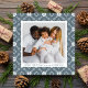 Festive square holiday card featuring your family photo framed in white with a slate blue and white nordic snowflake patterned background. Personalise the nordic snowflake Christmas card with your custom greeting and family name in slate blue lettering. The card reverses to display your personal message.